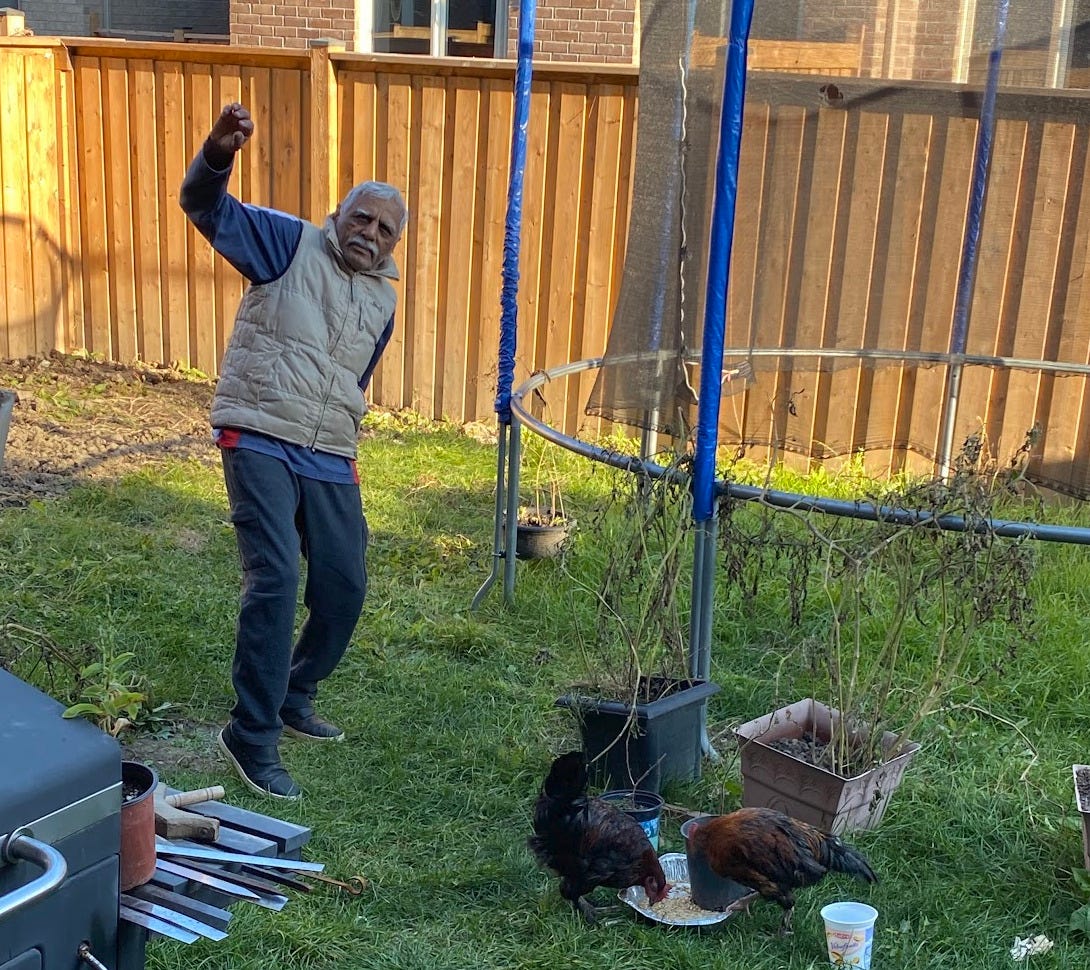 Abu ji spoke some English. He had a tendency to make friends with the other old men on our street, and as they were often of different backgrounds, they needed a common language. Abu ji spoke many languages: Urdu, Hindi, Punjabi, English, Arabi (he spent most of his adult life working in a printing press in Dubai and sending money back home to Amma and my Baba), Farsi. But he did not speak Creole or Italian or Spanish. English was the common denominator. He spoke English to talk to his friends and chat with our neighbours and make generally everyone adore him. He spoke Urdu to his family and the chickens he forced baba to let him keep in the backyard.